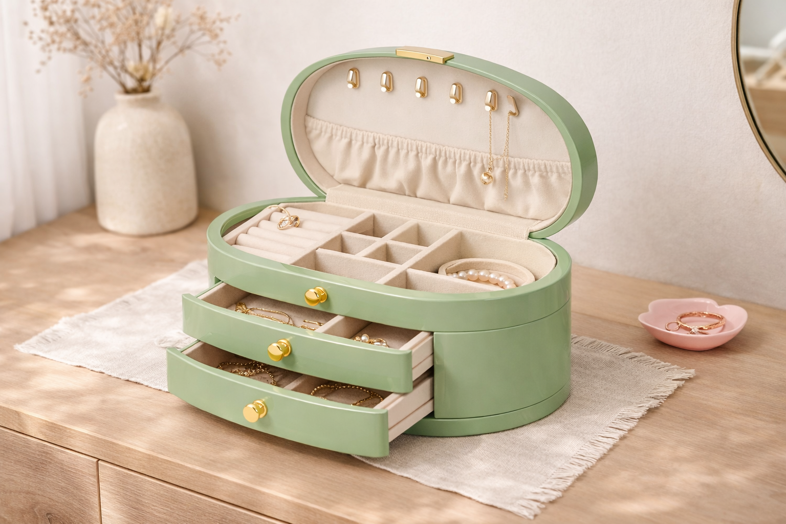 Designed with a soft green finish and refined details, this jewellery storage box keeps your favourite pieces neatly organised and protected. Multiple compartments and smooth drawers offer easy access to rings, earrings and bracelets, while the velvet-lined interior adds a touch of everyday luxury. A timeless piece that fits beautifully on any dresser or bedside table.